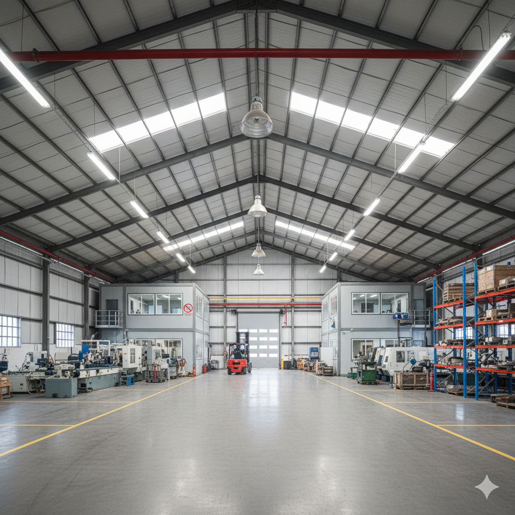• Open Floor Layouts: Planning wide, column-free spaces using pre-engineered steel structures to ensure maximum usable area for machinery, production lines, and storage.